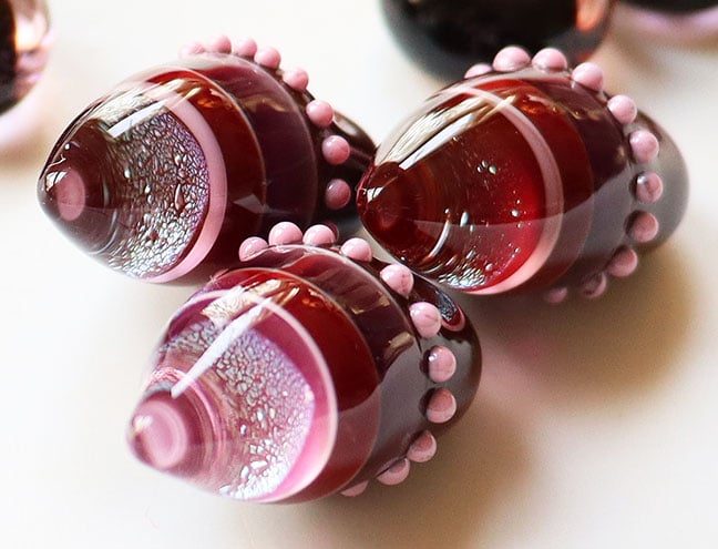 Wine, chocolate and roses - these spikes are fit for a date night, even if they ARE your date, and from what I hear these days, I can't blame anyone that chooses beads over dating. These colors are inspired by the many hues of dark chocolate and burgundy coming into the handbag department this autumn, and rosy pinks are always a shoo-in with those darker colors. We have 3 Spikes with an opaque dark chocolate base and adorned with rosy pink bumps, each one a bit different than the others, all trapping a shimmering slice of dichroic under the spiky end. Included are 4 chunky spacers, also with a dark chocolate brown base and encased with a variety of pinks. I feel these differences in pinks would have been more noticeable if the spacers were etched, but that would definitely not go with the glossy glassiness of the spikes, so this is what we have. I like adding these to a keyring or something about the size of it, but I've seen horseshoe shaped pendants that you can add your own things to, and that might be a quick, easy solution for the question of what to do with these. It helps that these have slightly larger than normal holes. Sky's the limit!