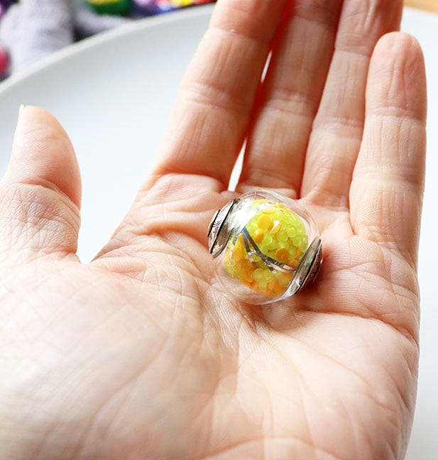 Since the caps are stamped with lemons, it might stand to reason that we should call this something lemon themed instead, but the much darker yellow and the much neon'er yellow reminded me more of a daffodil at first glance. The strands of shiny silver tinsel and silver glitter plus transparent lemon green/gold shift glitters add a bit more interest. As mentioned, the sterling silver caps are stamped with little lemon wedges, and the brass core (which isn't so obviously brass) holds it all in place and is a bit easier on the pocketbook than fine or sterling silver tube. Sling it onto a chain and go, use it for a rearview mirror or handbag charm or put it on your desk to look at when you need to escape for 30 seconds.