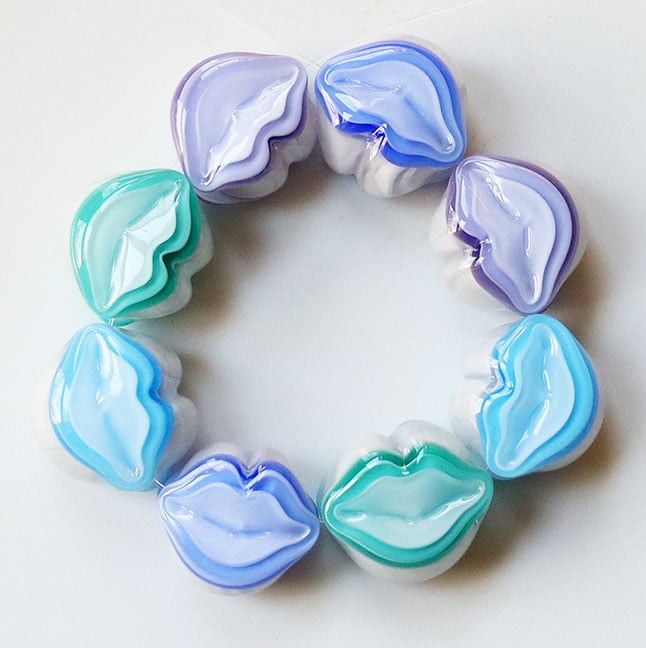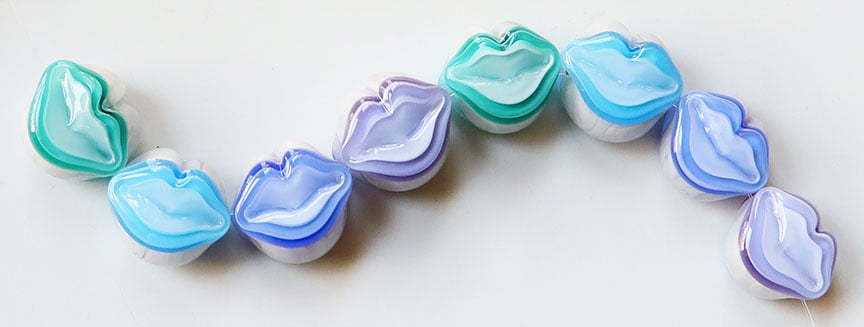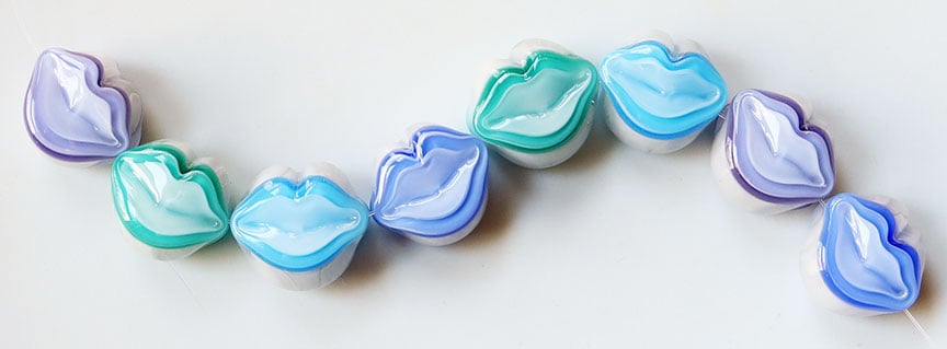 These Smooches are MWAH! There's something about this grey encased in clear that makes the bestest backdrop for these cool toned gradients. It's so much better than white. It's kinda like when you're sneaker shopping and they're all so darned white that you just know the moment you put them on the tar is gonna ooze up out of the cracks in the street and all the spaghetti dinners and blueberry pie desserts in the whole neighborhood are gonna jump down off their plates and come running at you. I mean... that's exactly what happens when *I* wear anything white. There are two Smooches in each gradient - sapphire, aqua, teal and purple, and even though they're titled Winter, they'd be good any time, anywhere, with the appropriate coordinating colors, of course. Everything is on BOTH sides of each bead!